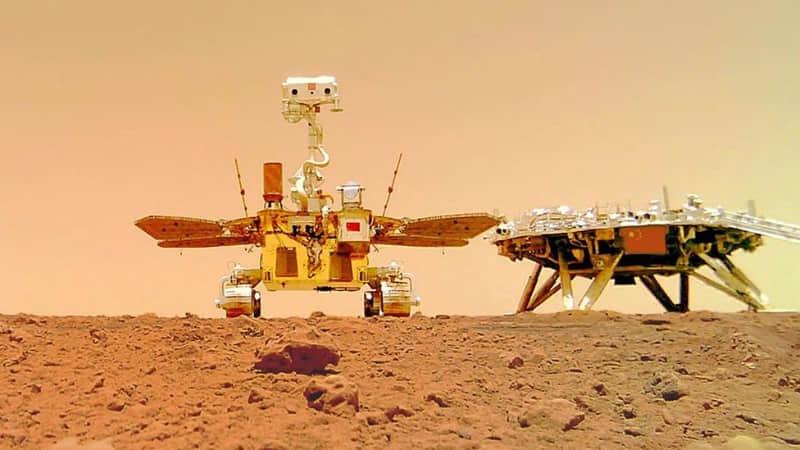 祝融号火星车行驶至着陆平台南向约 10 米处,释放安装在车底部的分离相机,之后火星车退至着陆平台附近。分离相机拍摄了火星车移动过程和火星车与着陆平台的合影。图像通过无线信号传送到火星车,再由火星车通过环绕器中继传回地面。全分辨率图像,包括着陆点的360全景图,可以在 CNSA 的官方网站上找到。