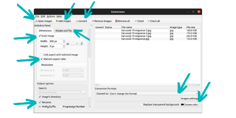 Converseen 是一个用于批量图像转换的自由开源软件。有了这个工具,你可以一次将多张图片转换成另一种格式、调整大小、改变它们的长宽比、旋转或翻转它们。