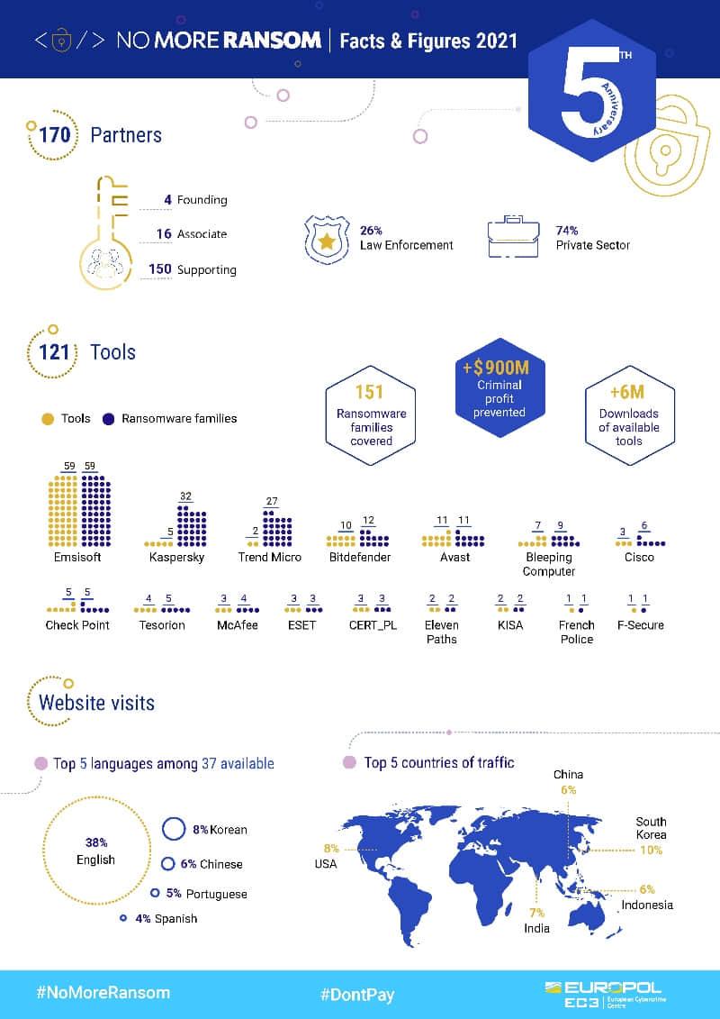 “不再索取赎金” 项目提供了 121 个免费的勒索软件解密工具,可以解密 151 个勒索软件家族。他们已经帮助 600 多万勒索软件受害者免费恢复了他们的加密文件。该网站允许用户上传加密文件,以帮助确定他们成为哪种形式的勒索软件的受害者,然后在有免费解密工具的情况下将他们引向该工具。