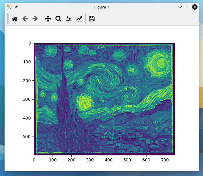 import cv2 as cv import matplotlib.pyplot as plt img = cv.imread(cv.samples.findFile("starry_night.jpg"),0) plt.imshow(img) plt.show()