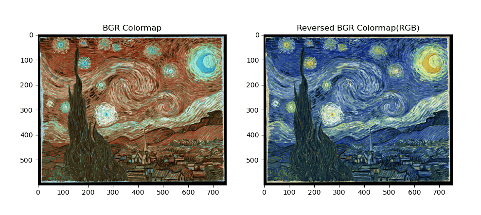 import cv2 as cv import matplotlib.pyplot as plt img = cv.imread(cv.samples.findFile("starry_night.jpg"),cv.IMREAD_COLOR) fig, (ax1, ax2) = plt.subplots(1,2) ax1.imshow(img) ax1.set_title('BGR Colormap') ax2.imshow(img[:,:,::-1]) ax2.set_title('Reversed BGR Colormap(RGB)') plt.show()