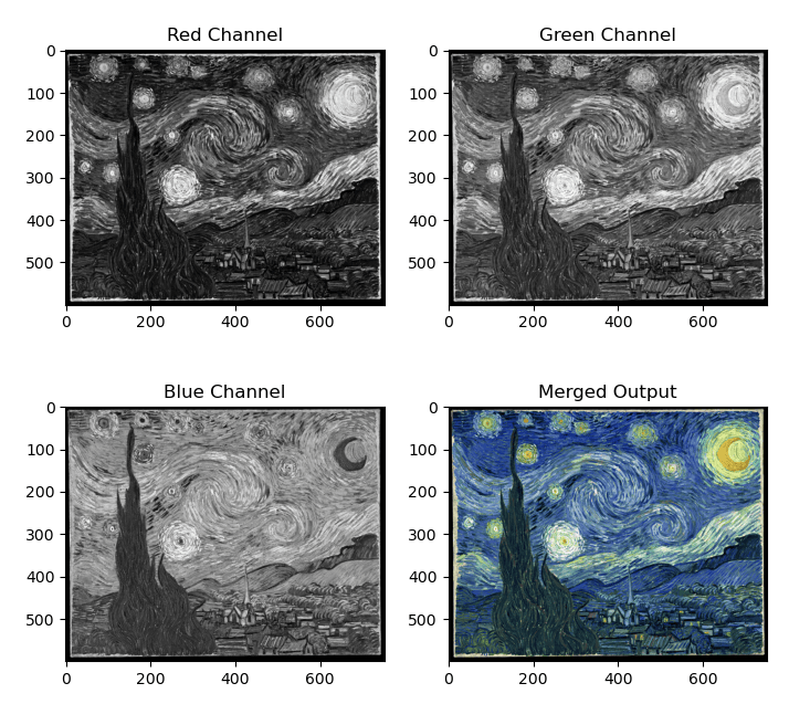 import cv2 as cv import matplotlib.pyplot as plt img = cv.imread(cv.samples.findFile("starry_night.jpg"),cv.IMREAD_COLOR) b,g,r = cv.split(img) fig,ax = plt.subplots(2,2) ax[0,0].imshow(r,cmap='gray') ax[0,0].set_title("Red Channel"); ax[0,1].imshow(g,cmap='gray') ax[0,1].set_title("Green Channel"); ax[1,0].imshow(b,cmap='gray') ax[1,0].set_title("Blue Channel"); # Merge the individual channels into a BGR image imgMerged = cv.merge((b,g,r)) # Show the merged output ax[1,1].imshow(imgMerged[:,:,::-1]) ax[1,1].set_title("Merged Output"); plt.show()
