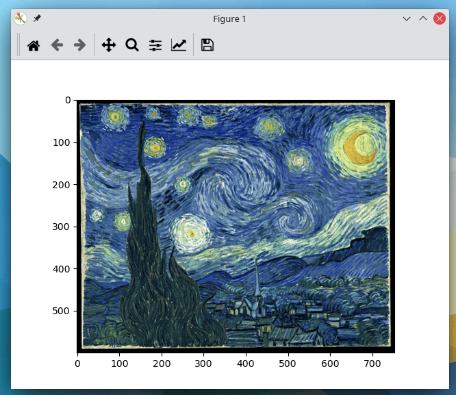 import cv2 as cv import matplotlib.pyplot as plt img = cv.imread(cv.samples.findFile("starry_night.jpg"),cv.IMREAD_COLOR) img_rgb = cv.cvtColor(img, cv.COLOR_BGR2RGB) plt.imshow(img_rgb) plt.show()
