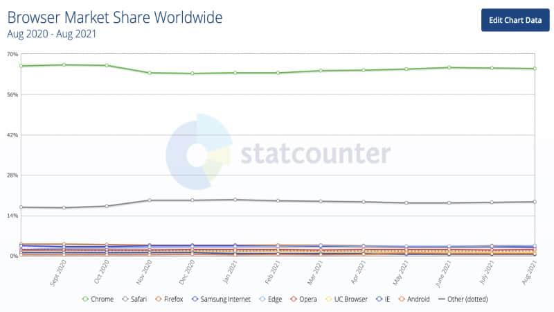 多年以来,Chrome 一直是全球最受欢迎的浏览器,而且地位日益巩固。而 Safari 也坐稳了第二名的位置。最近的一次的 Statcounter 的报告显示,Chrome 以 64.92% 份额稳居榜首;Safari 以 18.77% 的份额占据第二名。而 Edge 为 3.56%,Firefox 3.54%,两者相差无几,正在争夺第三名。自从 Edge 转向基于 Chromium 的版本以来,它一直在上升,而 Firefox 浏览器近年来的用户数量却在急剧下降。不但如此,排在其后的三星浏览器 Samsung Internet 份额为 3.06%,相差也不多。