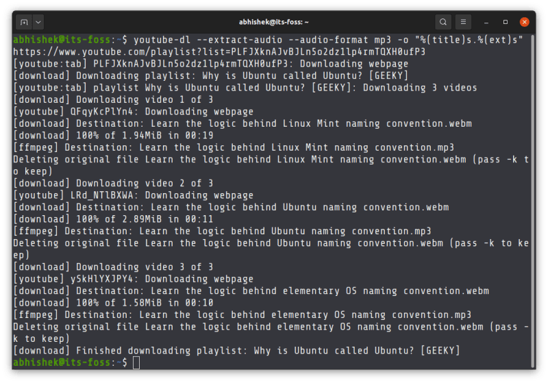 youtube-dl -x --audio-format mp3 https://www.youtube.com/watch?v=m_PmLG7HqbQ [youtube] m_PmLG7HqbQ: Downloading webpage [download] Zorin OS 16 Review - It's a Visual Masterpiece-m_PmLG7HqbQ.m4a has already been downloaded [download] 100% of 4.26MiB [ffmpeg] Correcting container in "Zorin OS 16 Review - It's a Visual Masterpiece-m_PmLG7HqbQ.m4a" [ffmpeg] Destination: Zorin OS 16 Review - It's a Visual Masterpiece-m_PmLG7HqbQ.mp3 Deleting original file Zorin OS 16 Review - It's a Visual Masterpiece-m_PmLG7HqbQ.m4a (pass -k to keep)