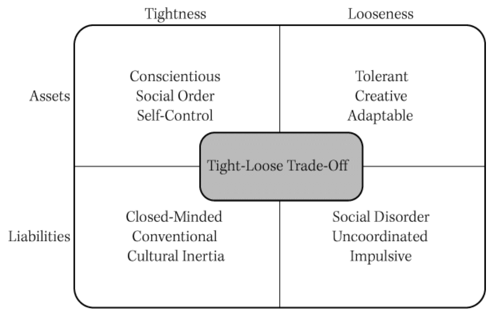 虽然并非所有情况都是如此,但紧密和松散的文化通常会表现出一些权衡;每个人都有自己的长处和短处。参见下面的图 1 。