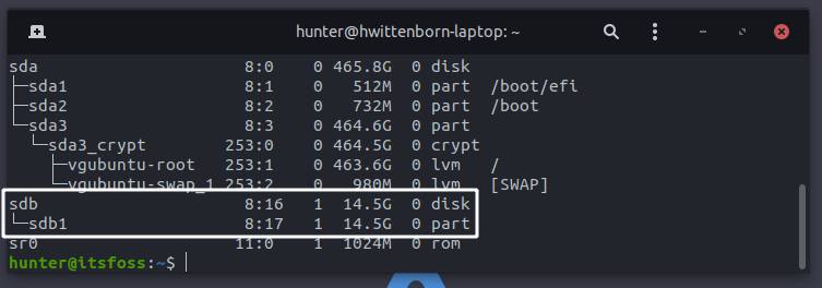 此路径可能因你的系统而异,你可以使用 lsblk 命令确认 USB 磁盘的路径。只需从列表中查找一个看起来像你的 USB 磁盘大小的驱动器,就可以了。