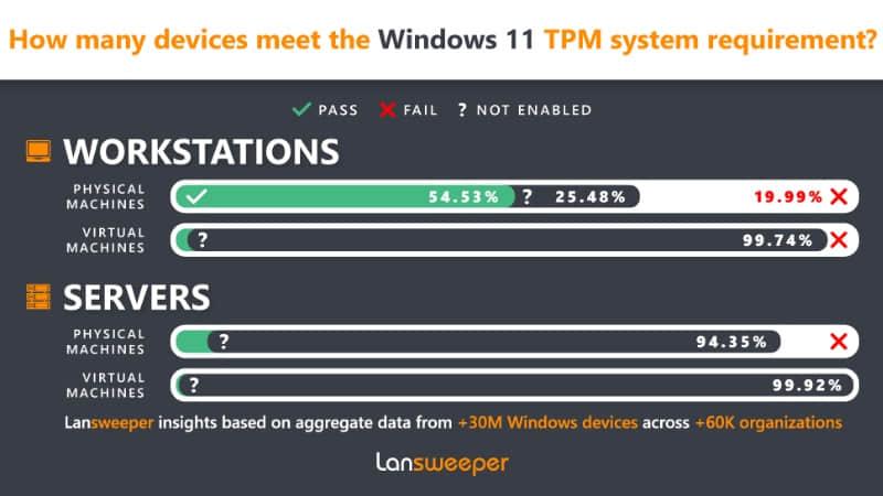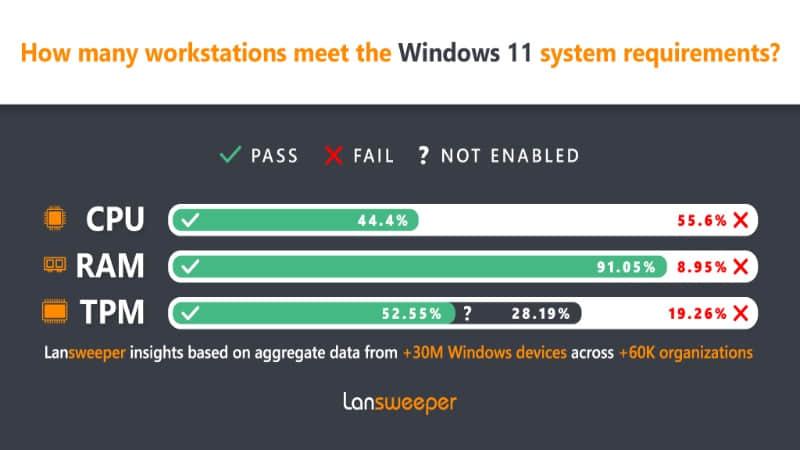 Windows 11 对特定处理器和 TPM 2.0 的要求意味着有很大一部分用户将无法升级到该操作系统。 换句话说,如果你的个人电脑是在 2017 年之前生产的,它在运行 Windows 11 时可能面临阻碍。一项针对企业的调查表明,只有 54.53% 的企业工作站确定可以升级,而绝大部分服务器都无法升级。这些设备中满足要求的 CPU 只有 44.4%,满足要求的 TPM 只有 52.55%。