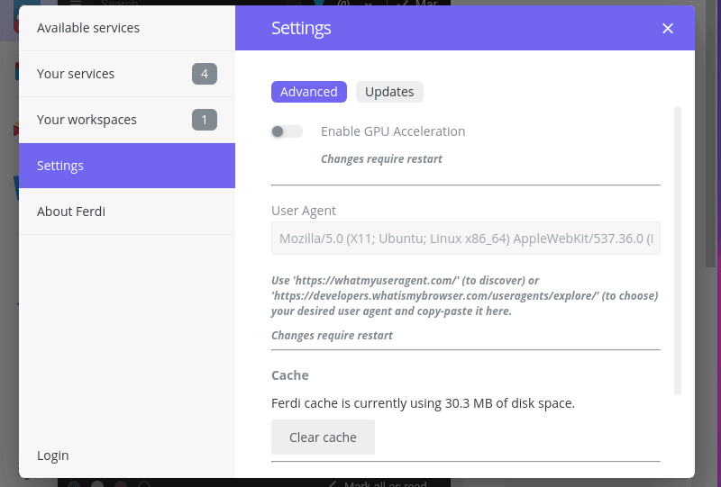 Ferdi 还提供一些高级选项,如 GPU 加速、通用黑暗模式、隐私切换、外观定制等。你甚至可以添加没有列出的自定义服务。