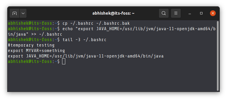 echo "export JAVA_HOME=/usr/lib/jvm/java-11-openjdk-amd64/bin/java" >> ~/.bashrc
