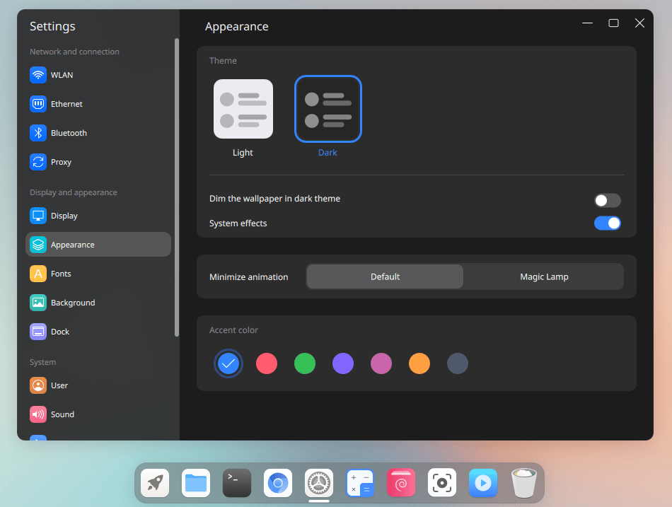 你还可以选择深色/浅色模式的主题,同时可以禁用系统效果,以尽量减少对性能的影响(如果你使用的是旧电脑)。