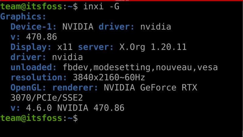 它会显示所有的图形设备(GPU)、正在使用的 GPU 驱动(有助于检查是否使用 Nvidia 驱动还是 nouveau 驱动)、显示输出分辨率和驱动程序版本。