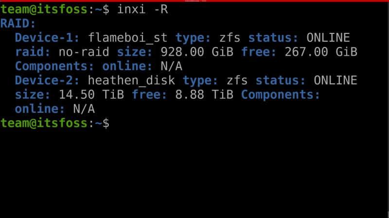 令人惊喜的是,它甚至显示了有关 ZFS RAID(默认情况下,多数 Linux 系统不包含该文件系统)的信息。它显示了 RAID 设备上文件系统的详细信息、状态(包含离线状态、总大小和可用大小等)。