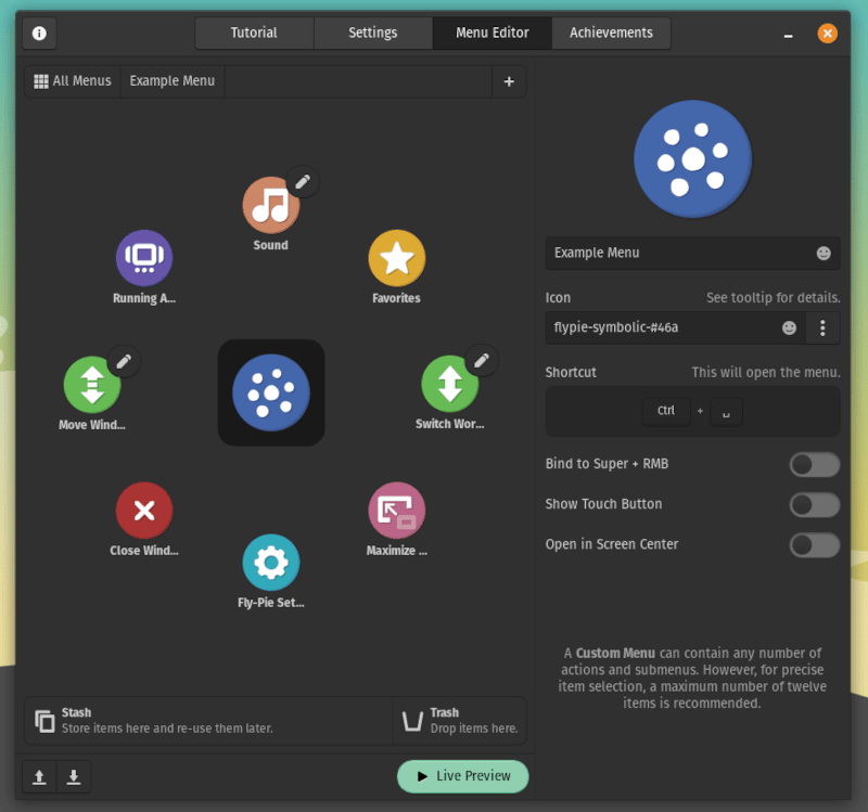Fly-Pie 菜单并不完全是为了取代应用启动器。然而,根据你的使用情况,它可以作为一个基于覆盖层的菜单或一个以鼠标操作为主的启动器来访问选项/应用,非常方便。