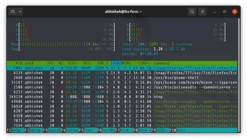 另一方面,htop 有一个漂亮的彩色输出,并且界面比 top 命令更直观。你可以垂直和水平滚动,以图形方式配置显示的信息。你可以在 htop 的输出屏幕上交互式地杀死进程。