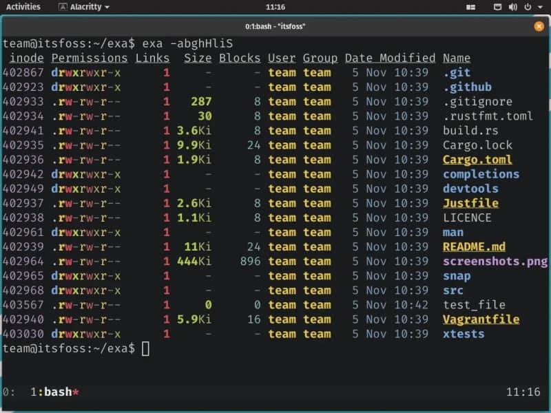 exa 命令行工具不止可以列出目录内容。它的默认设置更好,使用颜色来区分文件类型和元数据。exa 还可以显示一个文件的扩展属性,以及标准的文件系统信息,如 inode、块数,以及文件的各种日期和时间。