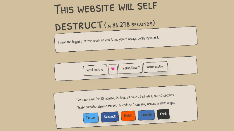2020 年 4 月,一个名为“这个网站会自毁”的网站悄悄上线了。它的自毁可以被网友们拯救:“你可以向我发送信息。如果 24 小时内我没有收到信息,将会永久自毁。”不过快两年过去了,它依然活着。这个网站上有各种各样的留言,你留言之后不但可以给这个网站续命,而且可以随机看到一条别人的留言。