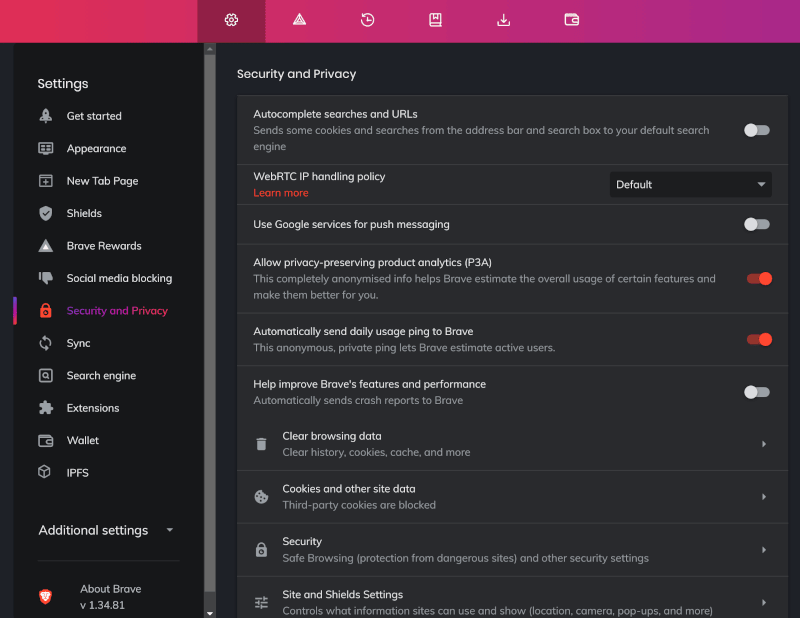 Brave 同样给你类似的控制级别,当然也有更高级的设置项,比如修改 WebRTC IP 处理政策,以及消息推送服务控制。