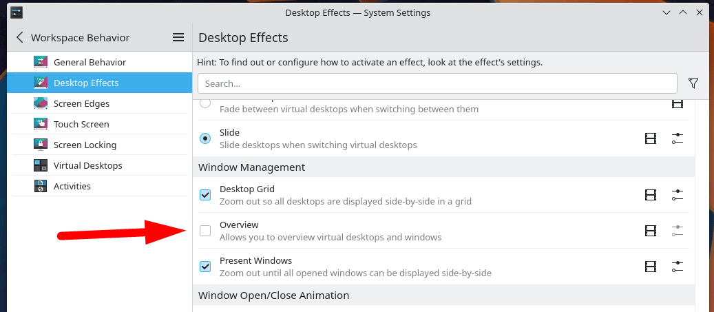 它可以让你轻松地浏览多个桌面,而默认是禁用的。你必须前往“ 系统设置 → 工作区行为 → 桌面效果 ”,在“ 窗口管理 ”选项下启用它并测试它。