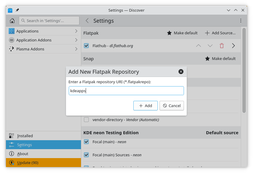 除此之外,你现在可以打开本地下载的 Flatpak 软件包,并通过“发现”进行安装(软件库也应会自动添加)。