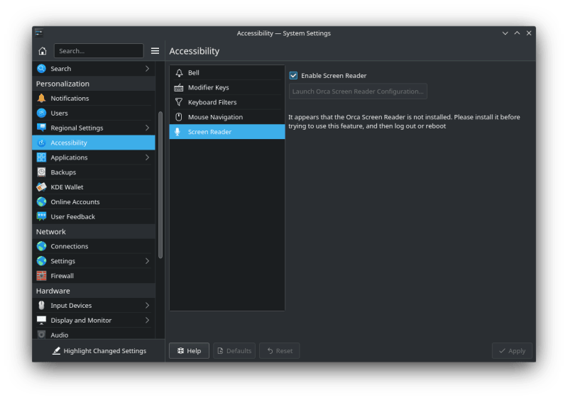 虽然 KDE 在几个方面做得很好,但增强桌面无障碍的可用能力非常有限(比如没有开箱即用的屏幕阅读器)。