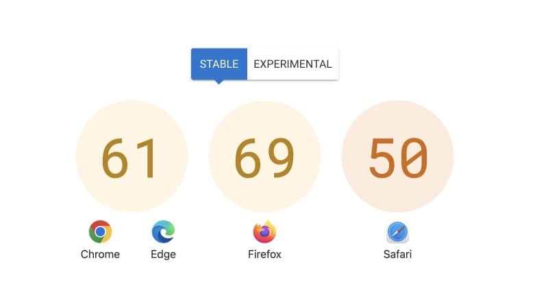 有史以来第一次,所有主要的浏览器供应商坐到了一起,苹果、谷歌、微软和 Mozilla 等合作建立了一个名为 Interop 2022 的基准,以解决浏览器兼容性问题。该基准主要是面向设计的,衡量主要浏览器在 15 个 Web 平台规范的测试套件中的表现。现有浏览器的稳定版本,情况看起来都相当糟糕。Chrome 和 Edge 得分 61 分;Firefox 得分 69分;Safari 得分 50 分。而它们的测试版本的表现要好一些。