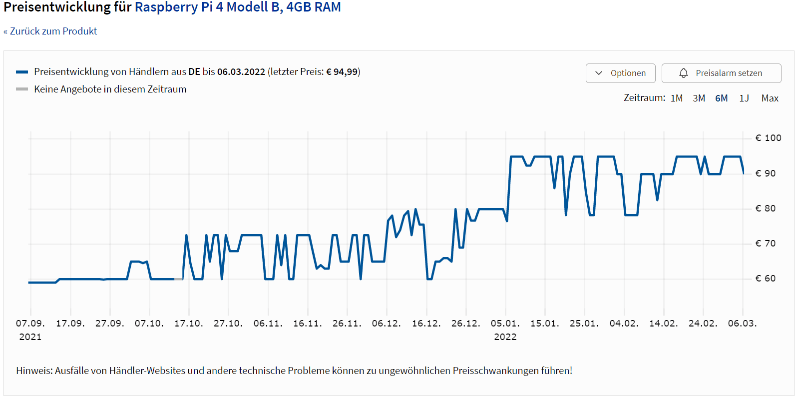 先看个价格趋势图吧,进入 2022 年,4GB 内存树莓派 4B 在欧洲市场的价格基本稳定在 €90,8GB 的价格基本在 €160 以上,涨幅均在 50% 以上。这在中国市场也差不多。要知道,树莓派 4 和树莓派 3 两兄弟的价格在 2021 年已经整整翻了一倍……写到这里,我留下了悔恨的泪水,为什么没有趁着便宜多买几片……