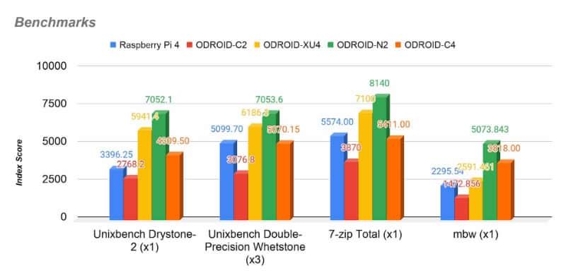 ODROID C4 搭载效能很高的 Amlogic S905X3 SoC,具有 4 个最高主频为 2GHz 以上的 Arm Cortex-A55 处理器核心,下图是 ODROID C4 与其他 ODROID 及树莓派 4 的 CPU 跑分对比,性能略优于树莓派 4。主频高达 650MHz 的 Mali-G31MP GPU的跑分也给大家列出来了。