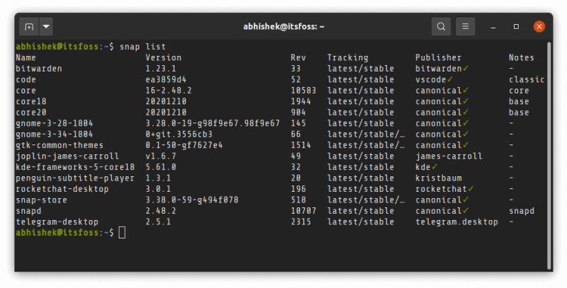 列出所有已经安装的 Snap 包名字:
