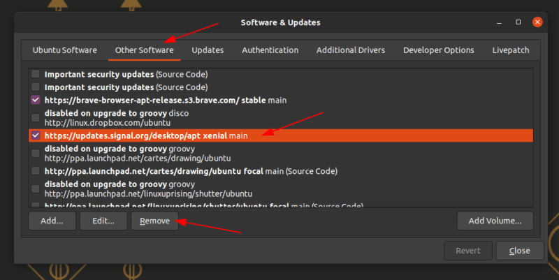 如果你也想同时删除掉 Signal 仓库,你可以选择图形化方法,通过“软件和更新”工具,在那里删除它。