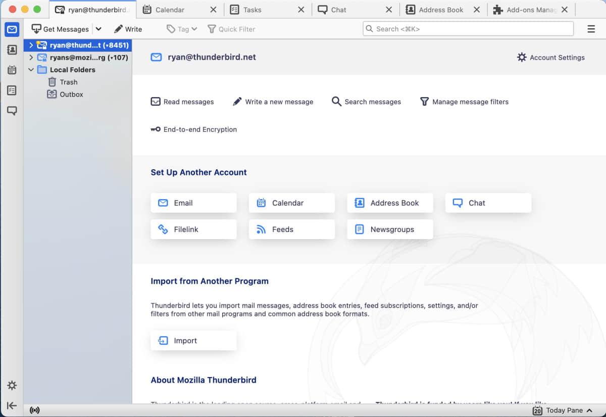 Thunderbird 102 版本改进了所有账户设置功能的体验,如添加账户、管理日历、导入配置文件等。