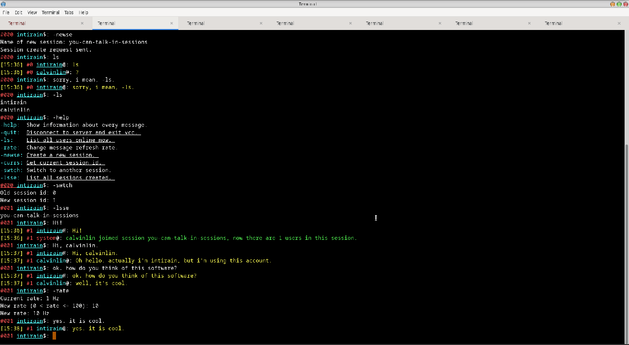 #000 intirain$: -help -help: Show information about every message. -quit: Disconnect to server and exit vcc. -ls: List all users online now. -rate: Change message refresh rate. -newse: Create a new session. -currs: Get current session id. -swtch: Switch to another session. -lsse: List all sessions created. #000 intirain$: