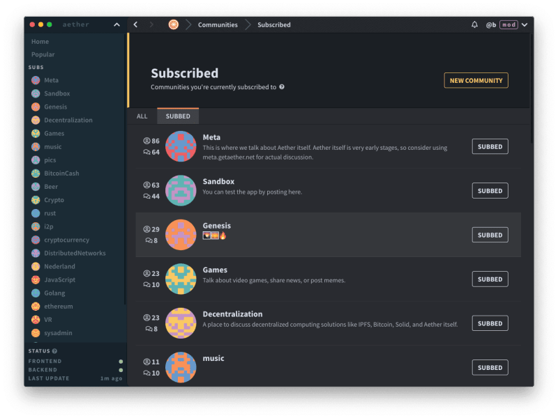 Aether 是一个开源、端到端的平台,用于创建自我管理的社区,并可以审查管理记录以及选举版主。