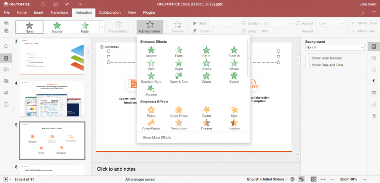 ONLYOFFICE 7.1 演示文稿编辑器现在支持各种动画,以及便捷地将一页幻灯片移动以及复制的能力。