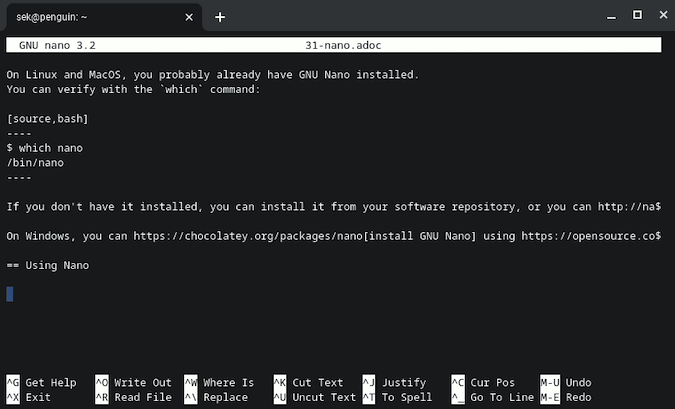 - GNU nano 对基于终端的文本编辑采取了大胆的立场:它提供了一个菜单。是的,这个不起眼的编辑器从 GUI 编辑器那里得到了提示,它告诉用户他们需要按哪个键来执行特定的功能。这是一种令人耳目一新的用户体验,所以难怪 nano 被设置为“用户友好”发行版的默认编辑器,而不是 Vi。