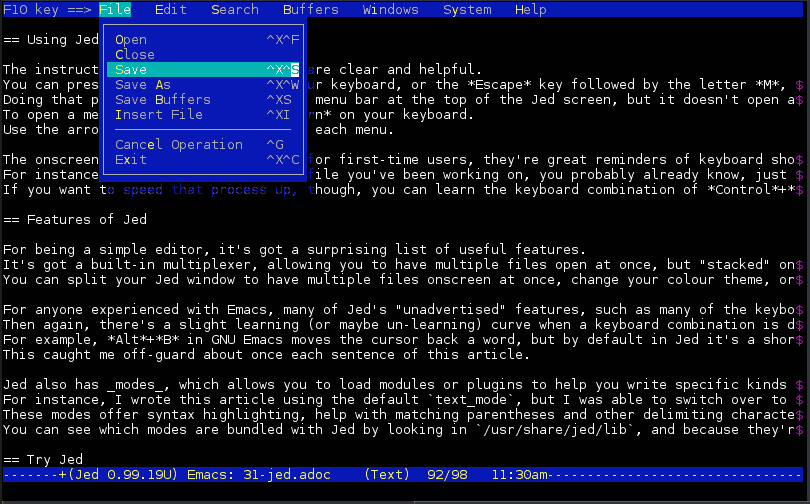 teajove命令。 - 另一个轻量级的 emacs 编辑器是 Jed。它的工作流程基于宏。它与其他编辑器的不同之处在于它使用了 S-Lang,这是一种类似 C 的脚本语言,它为使用 C 而不是使用 Lisp 的开发人员提供了扩展的机会。