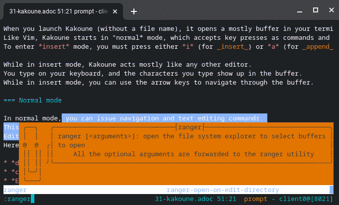 vimtutor)。 - Kakoune 是一个受 Vim 启发的应用程序,它具有熟悉的简约界面、短键盘快捷键以及独立的编辑和插入模式。乍一看,它的外观和感觉很像 Vi,但它在设计和功能上有自己独特的风格。 它有一个小彩蛋:具有 Clippy 界面的实现。