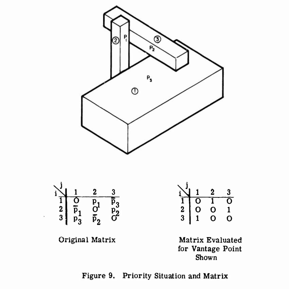 不过,该矩阵方法的主要缺点在于,为了在场景中表示出 n 个物体,你需要一个尺寸为 n 2 的矩阵。于是,研究人员们继续深入,探究将遮挡矩阵表示为“优先级列表”的可行性,该列表的尺寸是 n,可确定物体绘制的顺序。他们随即发现,诸如上图此类场景根本无法确定顺序(因为它存在循环阻塞的现象)。因此,他们花了很多时间来阐明“合适”与“不合适”场景之间的数学区别。最后,他们得出了一个结论:至少对于“合适的”场景下,优先级列表是可以制作出来的;而对场景设计师来说,避免设计出“不合适”的场景也不是一件难事。但是,他们并没有说明如何生成该列表。可以说,这份 1969 年的研究的首要贡献在于提出了:至少,在 理论上,可以采用平面分割的方法,对场景中的物体进行渲染排序。