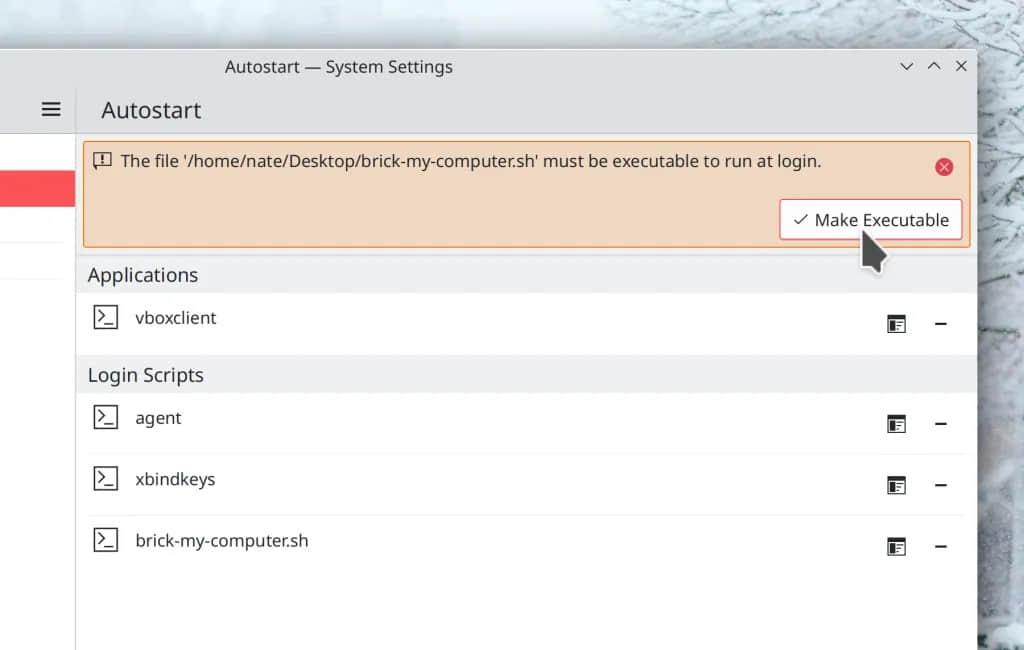 另一个例子包括,如果你在系统设置的 “ 自动启动 Autostart ” 窗口的 “ 登录脚本 Login Scripts ” 部分添加一个 Shell 脚本,而该脚本没有被标记为可执行,就会显示一个警告。此外,它还包括一个按钮,单击即可设置为可执行。