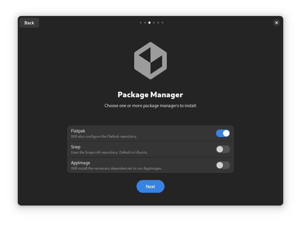 • 在其安装后的首次设置时,允许你选择并启用 Flatpak/Snap/AppImage