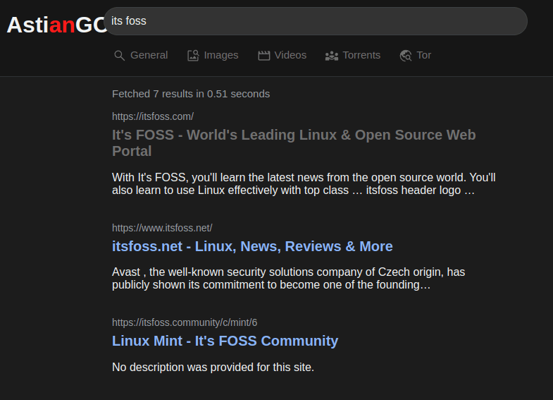 我们已经实现并开发了一个完全开源的搜索引擎,没有使用第三方的 API,它不存储用户的 IP 地址,不存储搜索历史。我们把这个搜索引擎称为 AstianGO,这个搜索引擎是用 PHP 开发的,它是自我托管的,尽管它还没有一个集成的更新系统,人们可以把它部署在他们的服务器上。