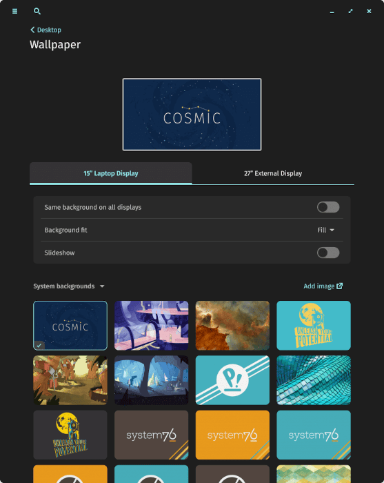 COSMIC 桌面环境可以让你设置一张壁纸,每个显示器一张,或者让你以幻灯片的形式循环播放多张壁纸。这是给多显示器用户的一个好消息!