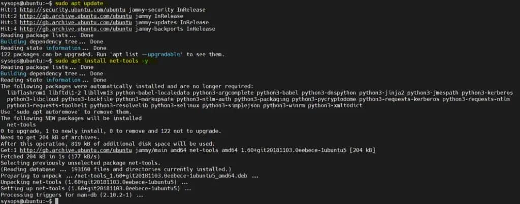 例如,你可以更新本地包索引,然后安装 net-tools 包: