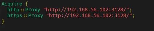 $ cat /etc/apt/apt.conf.d/proxy.conf Acquire::http::Proxy "http://192.168.56.102:3128/"; Acquire::https::Proxy "http://192.168.56.102:3128/";