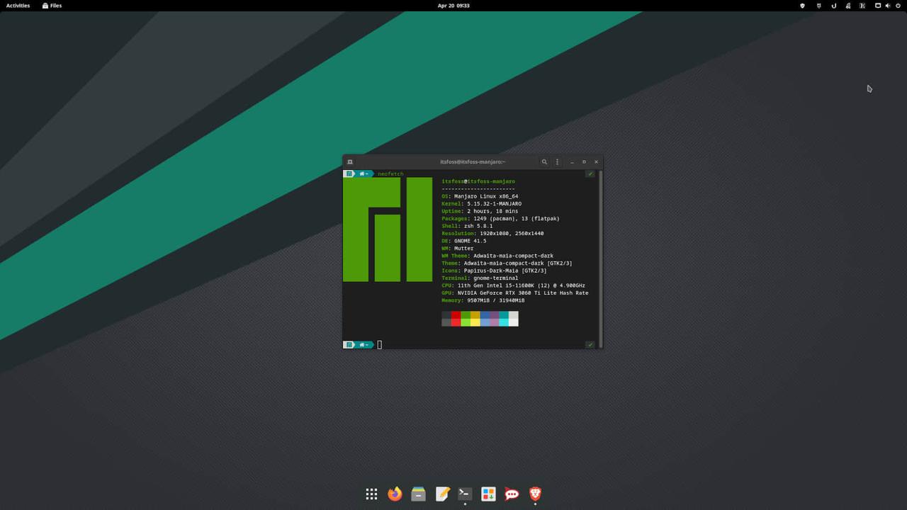 换句话说,我可以直接尝试不同的东西。令我兴奋的是,终端提示符和遵循 Manjaro 品牌的Shell(或终端)的主题也采用了 Manjaro 的强调色,非常令人印象深刻!