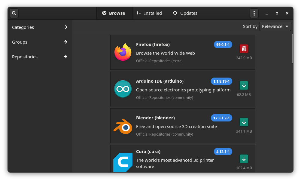 在 Manjaro Linux 中,我发现安装了 Pamac 作为包管理器。这似乎是 在 Manjaro Linux 上安装和卸载软件的最佳方式之一。