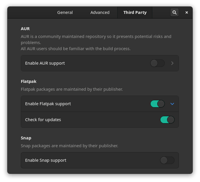 总体来说,体验非常流畅,没有出现任何麻烦。为了提升体验,包管理器还可以通过调整 pamac 的偏好设置,快速启用对 Flatpaks/Snaps/AUR 的支持。