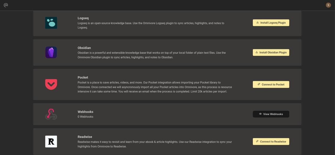 然后,我转而去检查了 在 Omnivore 上 的插件支持。它支持几种不同的插件,允许你从各个地方导出内容。