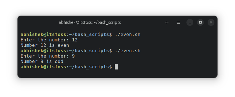 #!/bin/bash read -p "Enter the number: " num mod=$(($num%2)) if [ $mod -eq 0 ]; then echo "Number $num is even" else echo "Number $num is odd" fi
