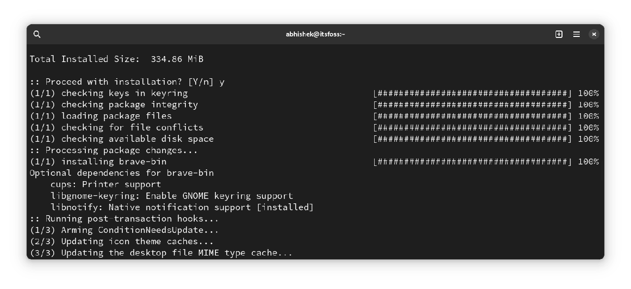 如果你安装了 Yay(或任何其他 AUR 帮助程序),那么安装 Brave 就像使用以下命令一样简单: